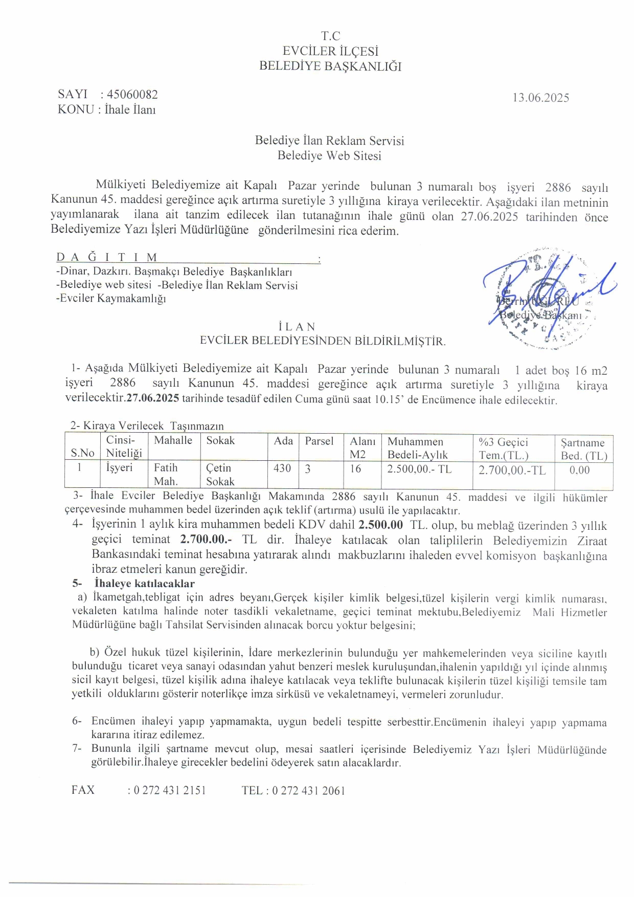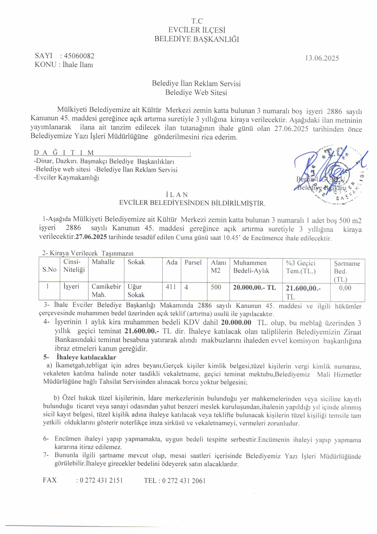 / EVCİLER BELEDİYESİ İHALE İLANI